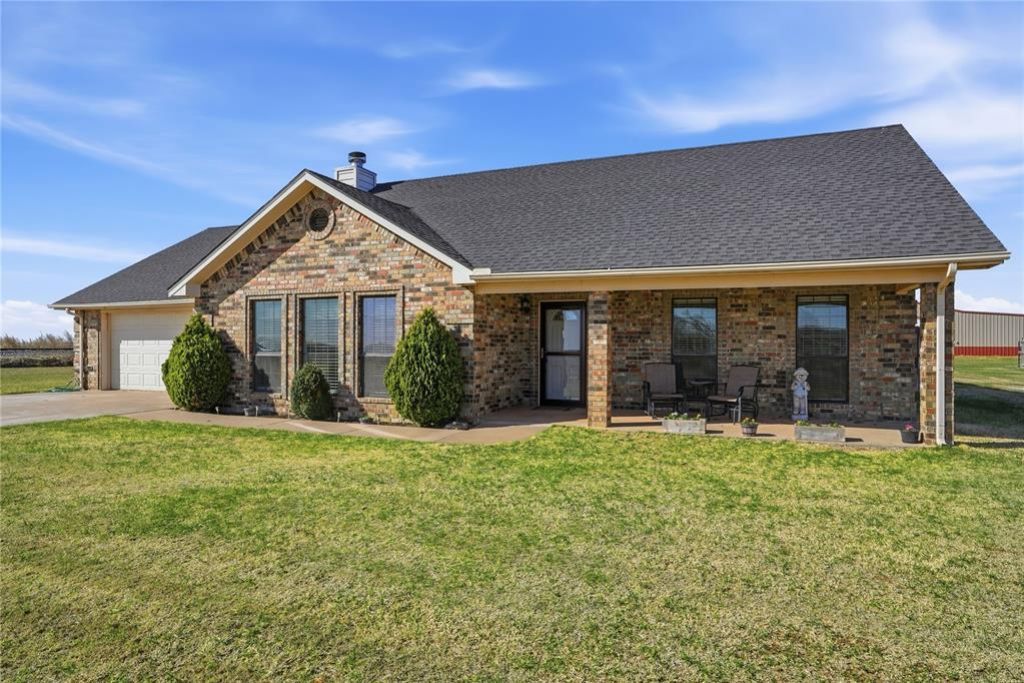 Great location! Conveniently situated just 10-15 minutes from Altus AFB, Navajo schools, grocery stores, shopping, the hospital, and local restaurants. This home offers excellent curb appeal with an extended front-porch and a two-car attached garage.Inside, you'll find an open living room featuring vaulted ceilings, a beautiful brick wood-burning fireplace with built-in bookshelf storage, and attractive wood-look vinyl flooring throughout the main living areas. The kitchen is spacious and includes modern cabinetry, quartz countertops, and a designated dining area with doors leading out to the oversized backyard.The split floor plan provides privacy, with a large primary suite that features an ensuite bathroom complete with double vanity sinks, a glass-enclosed walk-in shower with modern frameless design, easy entry soaker tub with handheld shower and a great closet space. The guest bedrooms are generously sized. Guest bathroom features two private vanity areas connected by a shared shower/tub, toilet space.Storage is great throughout the home, including additional cabinetry in the laundry room. A covered patio and storage building in the backyard complete this property.Schedule your showing today to see everything this home has to offer!