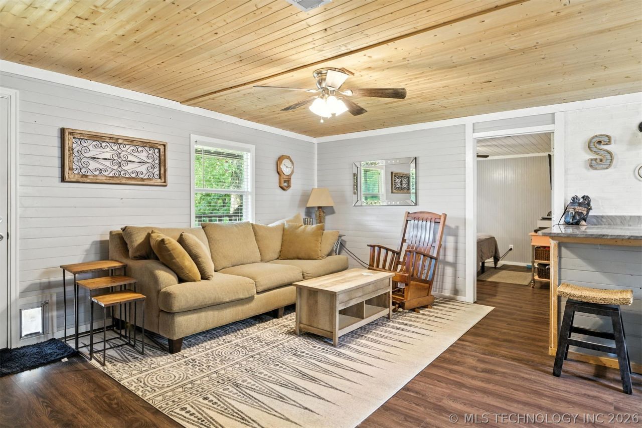 Offering privacy and peacefulness, this cozy metal home is situated on almost an acre corner lot and is less than a mile to Lake Texoma. (walking trail to the lake is located across the road) Perfectly suited as a permanent residence, weekend retreat, Airbnb, or vacation getaway, this charming property offers both comfort and convenience. Inside, you'll find a thoughtfully designed split bedroom plan with all new central heating and air, energy efficient windows, stunning quartz countertops, and a tankless water heater. The inviting covered front porch is ideal for enjoying morning coffee while taking in the peaceful surroundings. Additional amenities include a spacious detached 18x20 garage/shop with electricity, providing ample space for storage, hobbies, or a workshop. Whether you're seeking a serene retreat or a smart investment opportunity, this home combines comfort, functionality, and location in one delightful package.