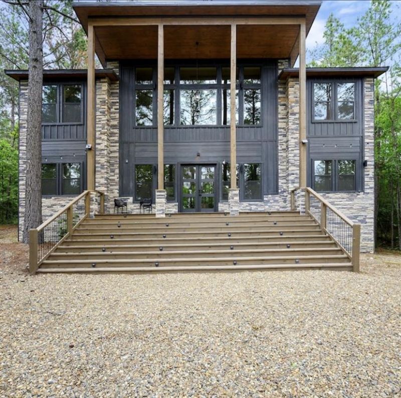 Exceptional luxury cabin just hit the market! Designed with both style and functionality in mind, this stunning 4 bedroom, 4 bathroom cabin offers 2,067 square feet and a layout ideal for a high-performing short-term rental.Upon arrival, the cabin immediately impresses with its grand presence and striking black exterior, complemented by a large circular drive providing easy access and plenty of space for parking, including room for boats and multiple vehicles.Step inside to a warm and inviting interior featuring beautiful light wood walls and soaring ceilings that create an open, airy feel throughout the main living space. Tons of windows. The living room is anchored by a dramatic floor-to-ceiling black slate gas fireplace, serving as a stunning focal point and gathering space for guests.The thoughtfully designed floorplan offers both comfort and flexibility. A unique catwalk overlooks the living area and connects two upstairs bedrooms, creating an architectural highlight while adding character to the home. These rooms can function as private suites or bunk rooms, making them ideal for maximizing guest capacity. Each of the four bedrooms includes its own en suite bathroom, offering privacy and convenience for guests.The two downstairs master suites provide a spa-like experience with large soaking tubs and beautifully designed glass-enclosed showers, adding an element of luxury that guests will appreciate.Situated on a flat 1.88-acre lot, this property offers incredible potential for future enhancements. The lot is wooded and provides ample space to add income-boosting amenities such as a pool or pickleball court.Outdoor living is equally impressive. A spacious back deck offers plenty of room for relaxing or entertaining, with beautifully crafted wooden steps leading down to the backyard and fire pit area, creating the perfect setting for evenings under the stars.